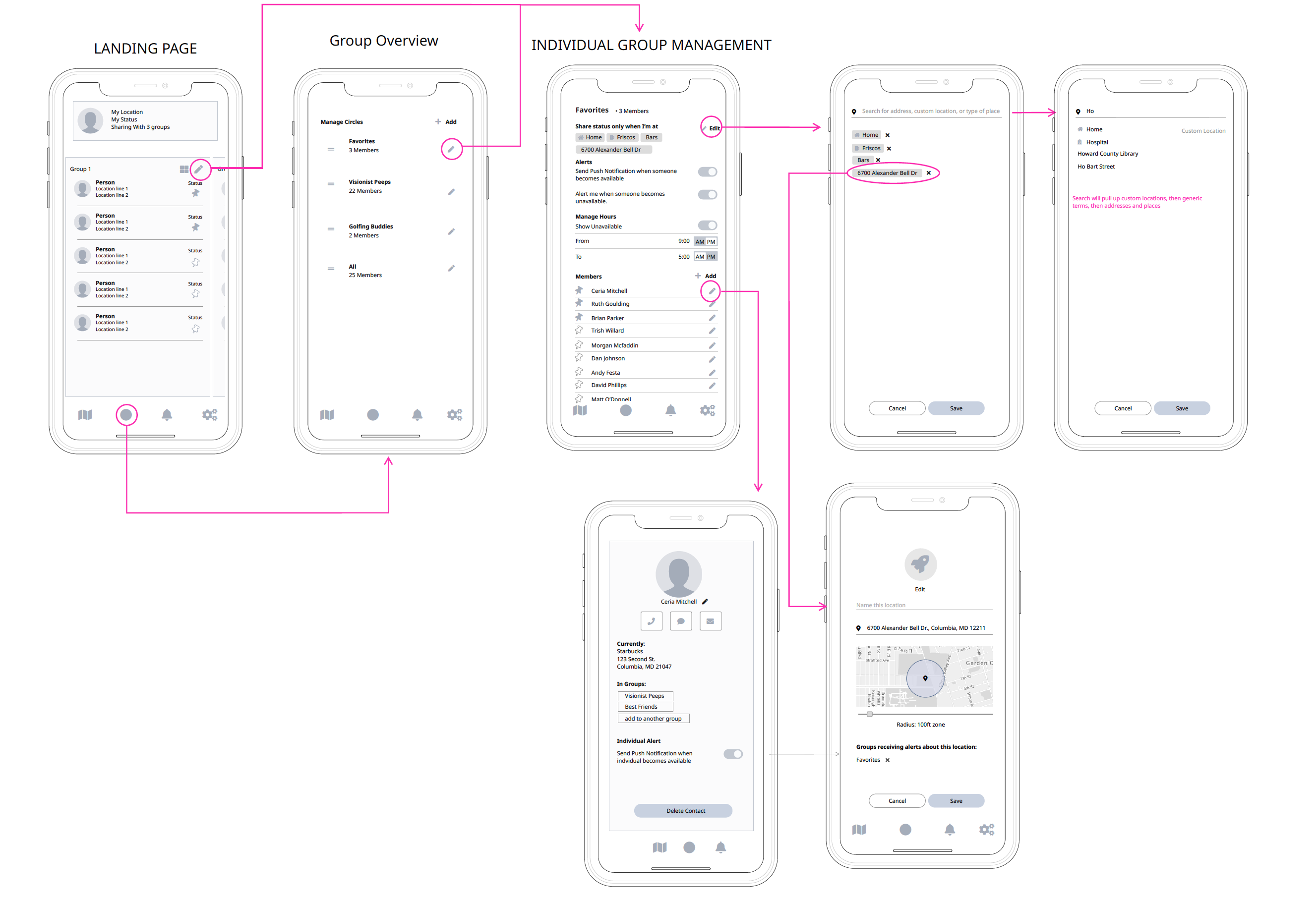 We did eventually manage to simplify and edit our ideas from the whiteboard and start putting together a more cohesive flow. Whiteboard notes were eventually turned into a graphical outline and once we were satisfied with the overall idea, we drilled down into wireframes.